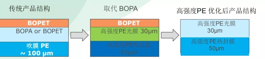 高強(qiáng)度PE膜,相比較傳統(tǒng)的PE吹膜或CPE膜,在提升機(jī)械強(qiáng)度的同時(shí),能實(shí)現(xiàn)材料輕量化,兼具優(yōu)異的光學(xué)性能、材料柔韌性,耐撕裂穿刺、耐揉折及熱封合牢固等優(yōu)點(diǎn)。